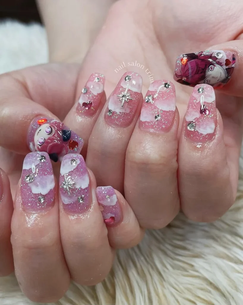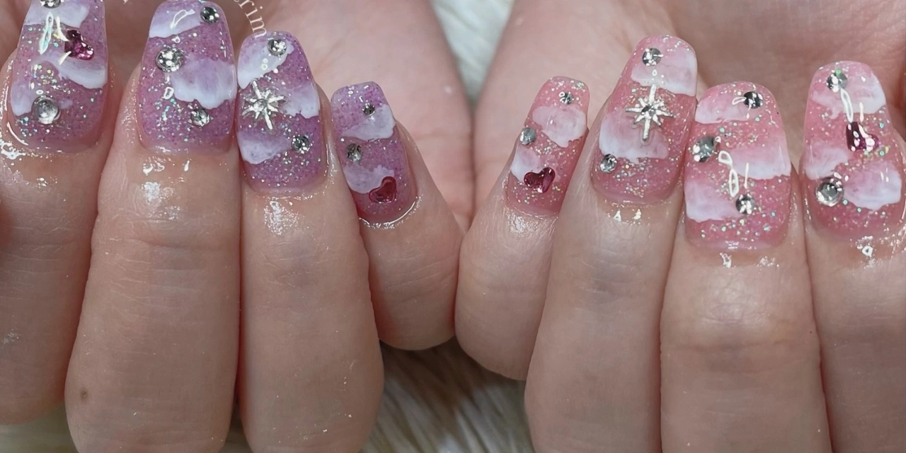 やわらかなピンクのラメをベースに、雲のグラデとストーンを重ねた華やかなデザインです。