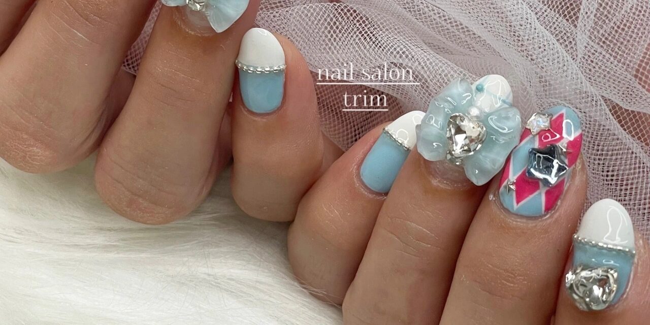 やわらかな水色と白をベースに、リボンモチーフとビジューを組み合わせた華やかなデザインです。